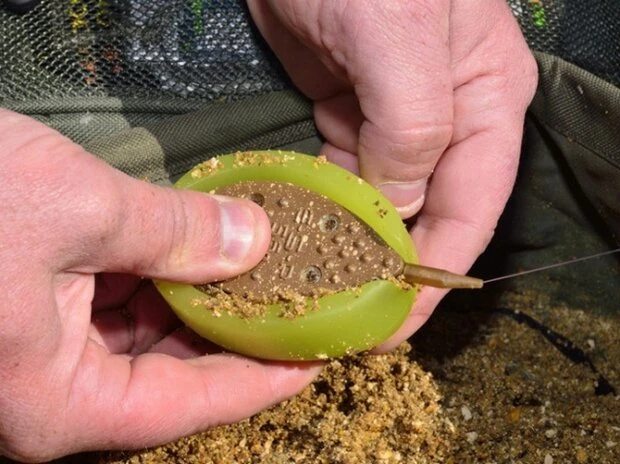 Leg je beaasde onderlijn in de mal, vervolgens vul je de mal met grondvoer of geweekte pellets.