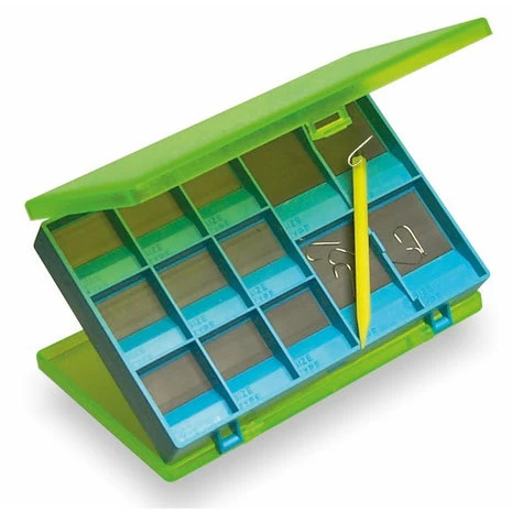 Elk compartiment heeft een hellend vlak om haken gemakkelijk uit de doos te kunnen nemen.Â
